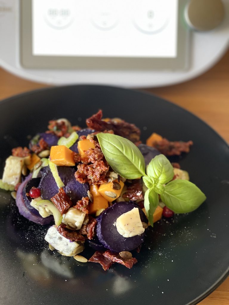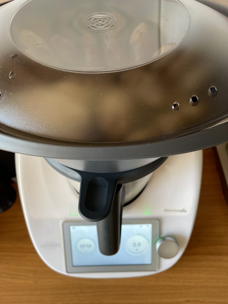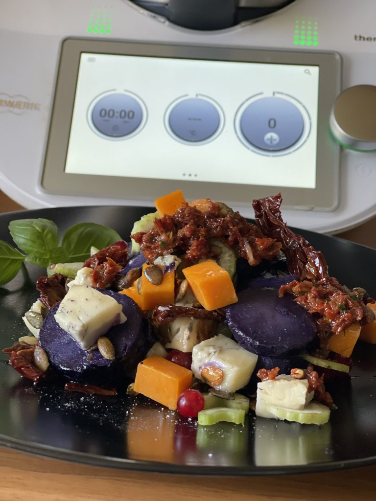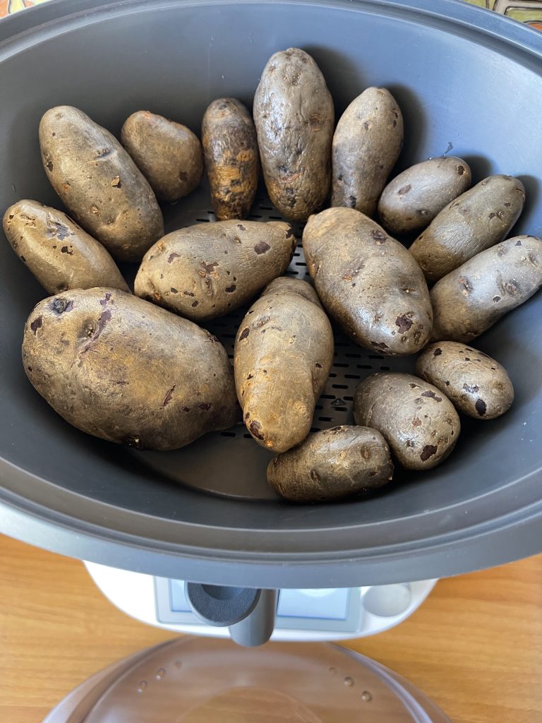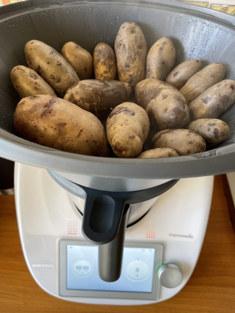 - Puneti in bol 1200 g apa, așezati vasul Varoma pe capac și așezati cartofii mov in coaja( spălați in prealabil) și fierbeți 40 min/temperatura Varoma/viteza 2;