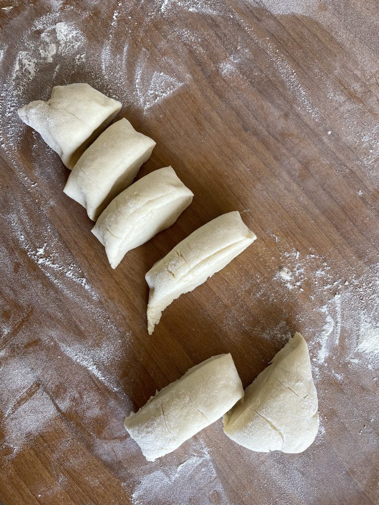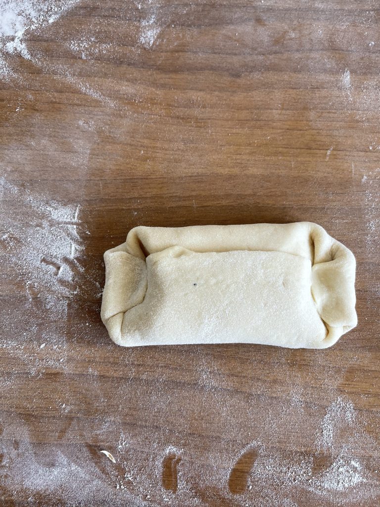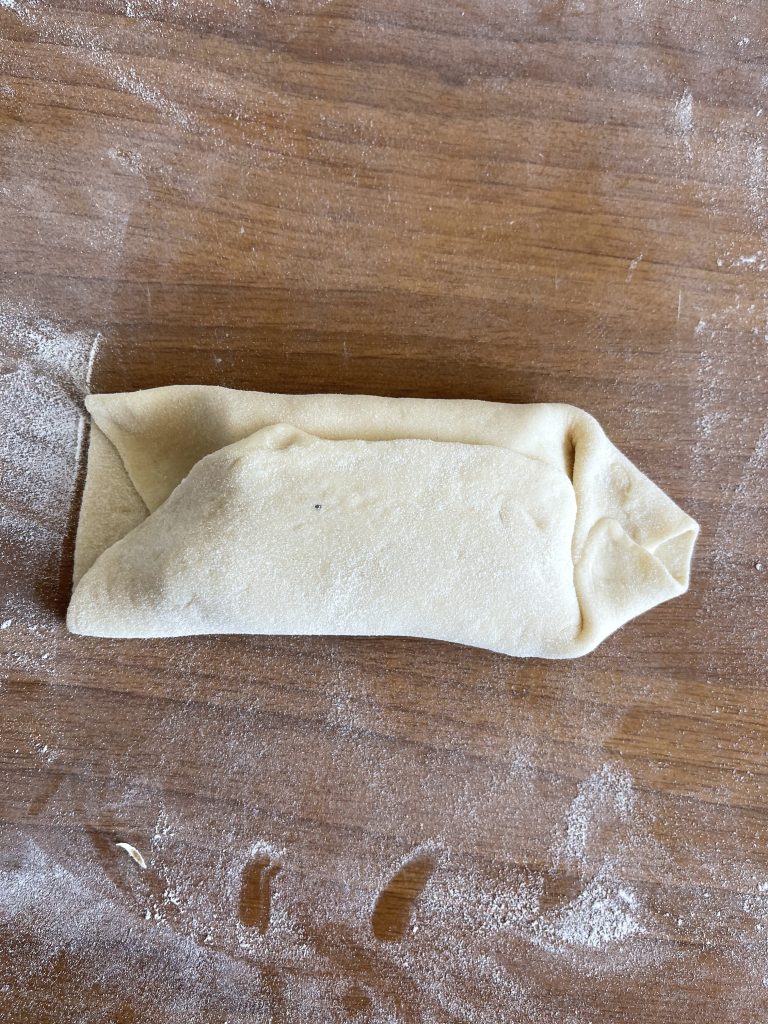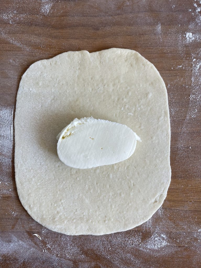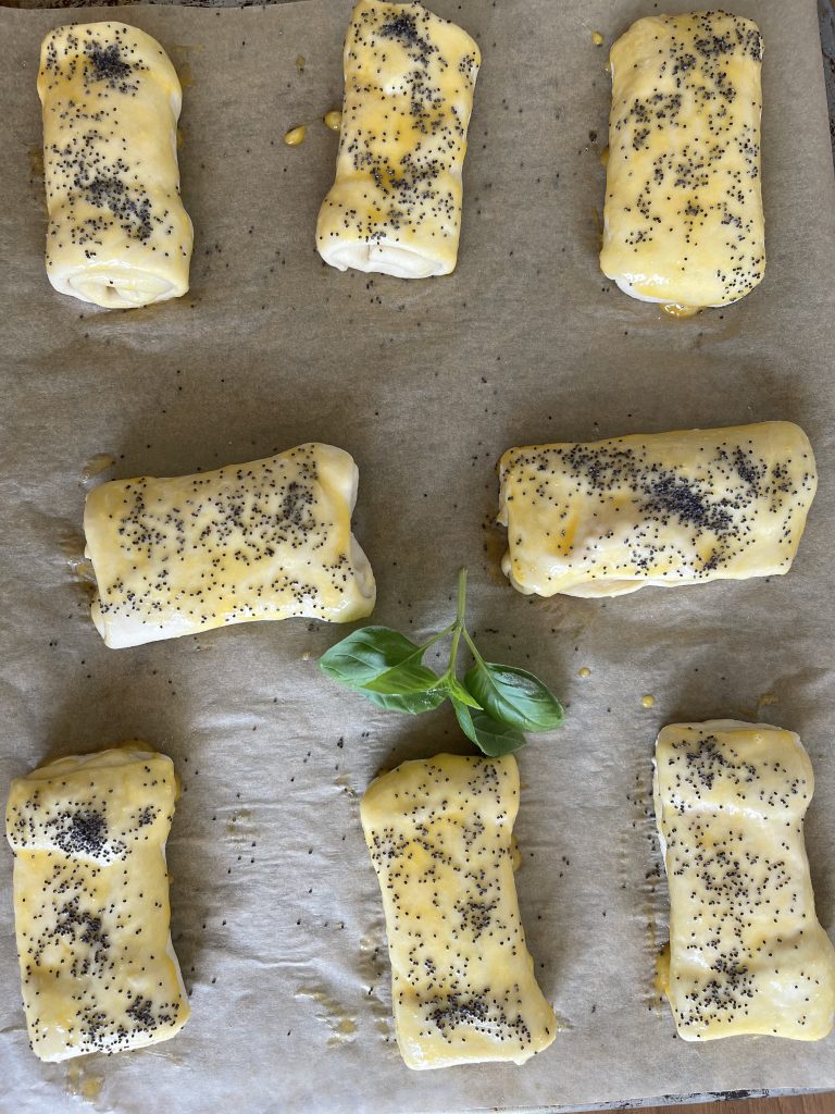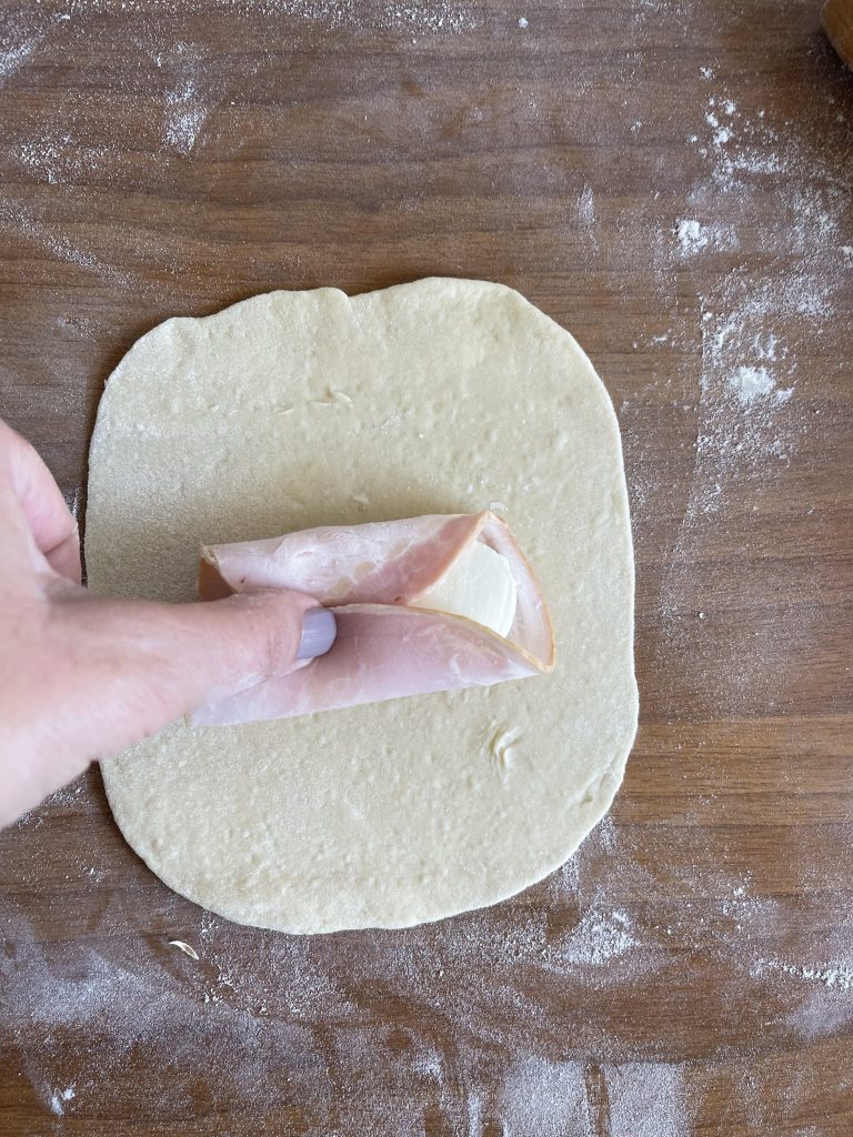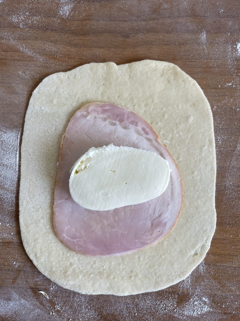 - Tăiați Dreptunghiul in 8 dreptunghiuri egale, apoi fiecare dreptunghi se întinde individual cu sucitorul, apoi se pune felia de șunca și o felie de mozzarella.Rulați șunca peste mozzarela și apoi împachetați cu aluatul formând un pachețel bine sigilat pe toate părțile;