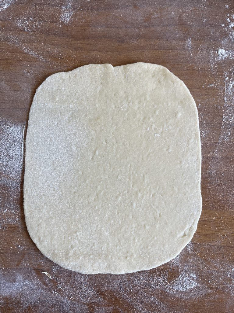 - Împărțiți aluatul in 2.Luați prima bila si întindeti o foaie dreptunghiulara de cca 40/30 cm pe blatul de lucru tapetat cu faina;