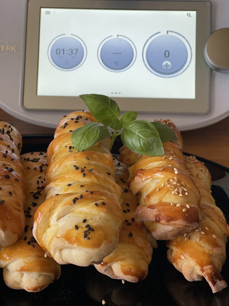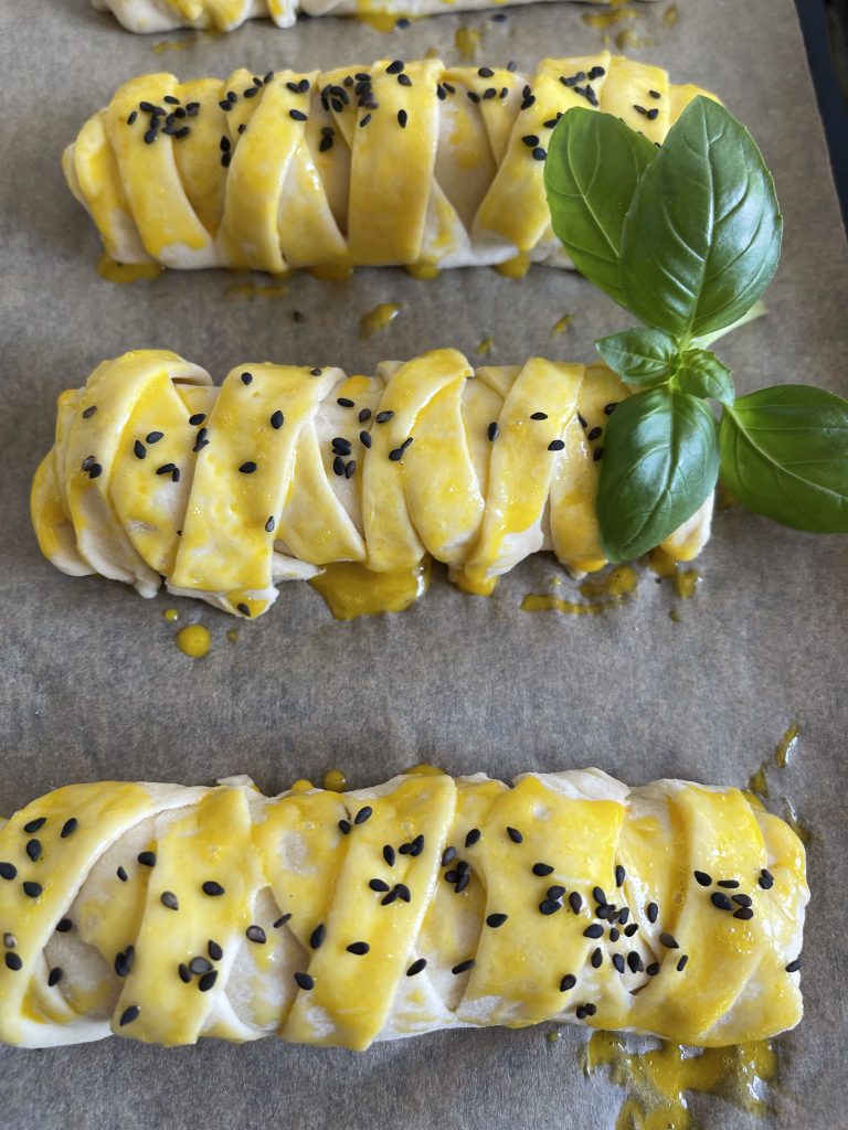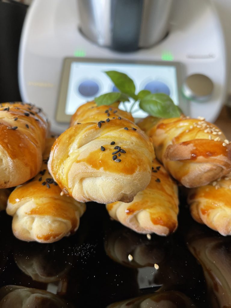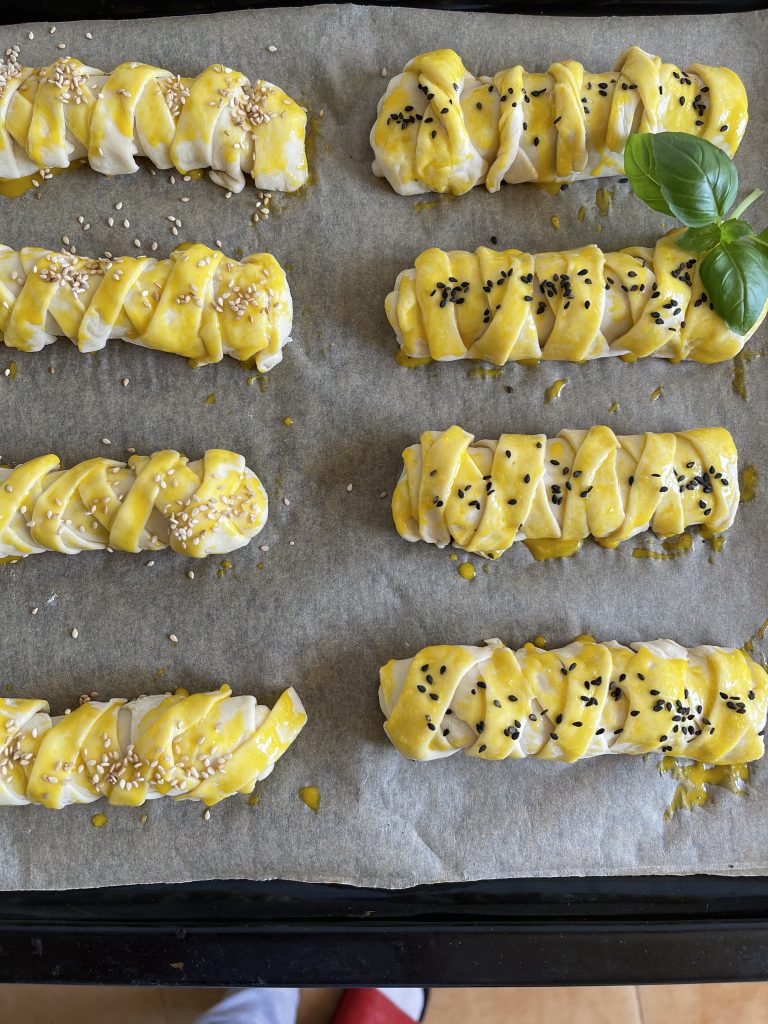 Ungeți fiecare rulou cu galbenus de ou si presărați susan alb sau negru. - Coaceti cca 25 minute in cuptorul preîncălzit la 180 grade.