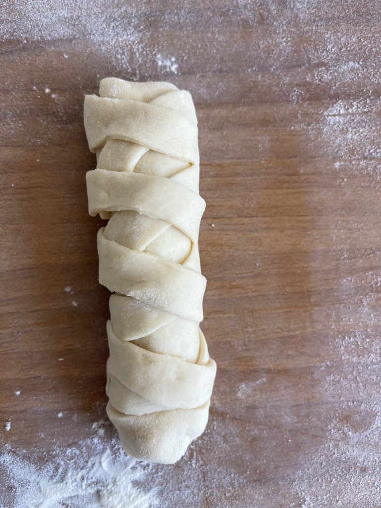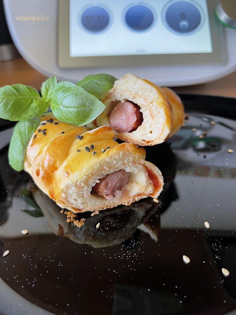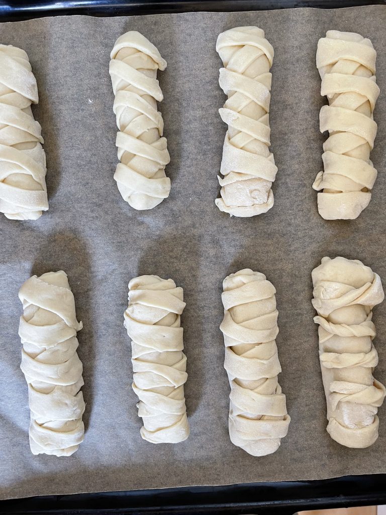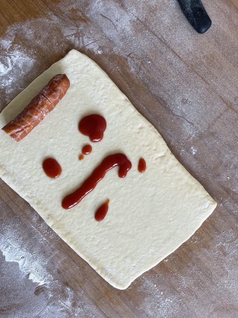 - Tăiați Dreptunghiul in 8 dreptunghiuri egale, apoi fiecare dreptunghi se întinde individual cu sucitorul, apoi se pune puțin ketchup si 1/2 de cabanos crestat. Rulati 3/4 din bucățică de foaie cu cabanosul in interior si apoi creditați cu cuțitul ca un pieptene si faceți o împletitura peste rulou.