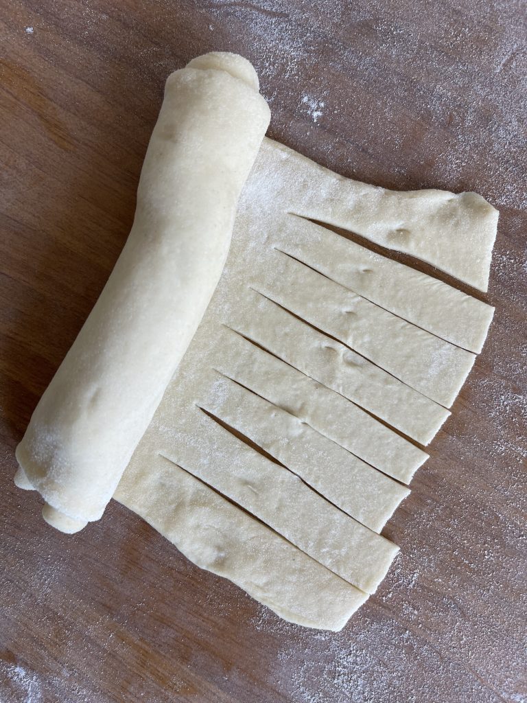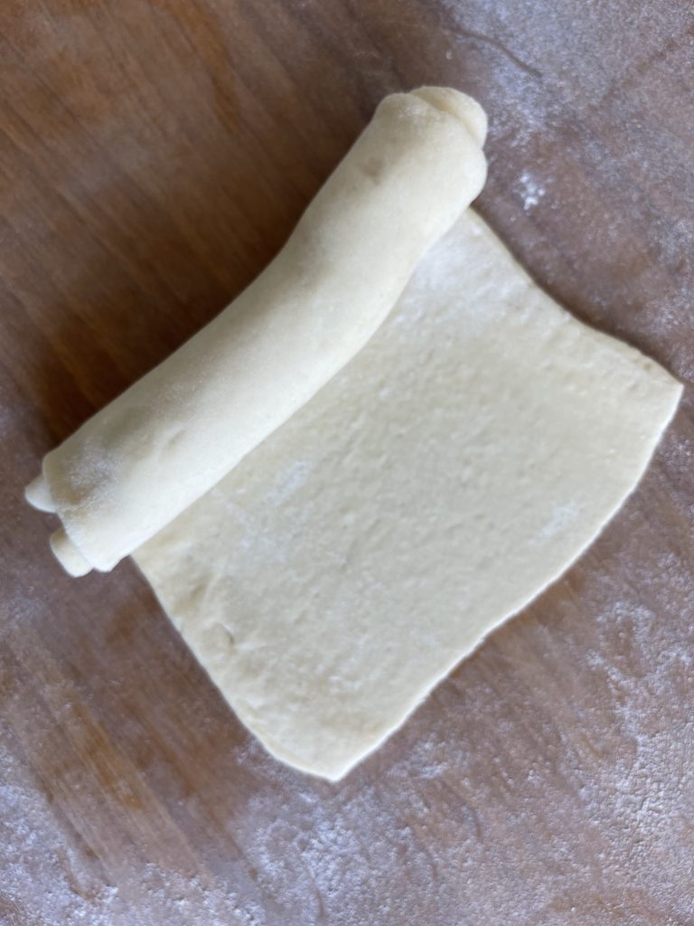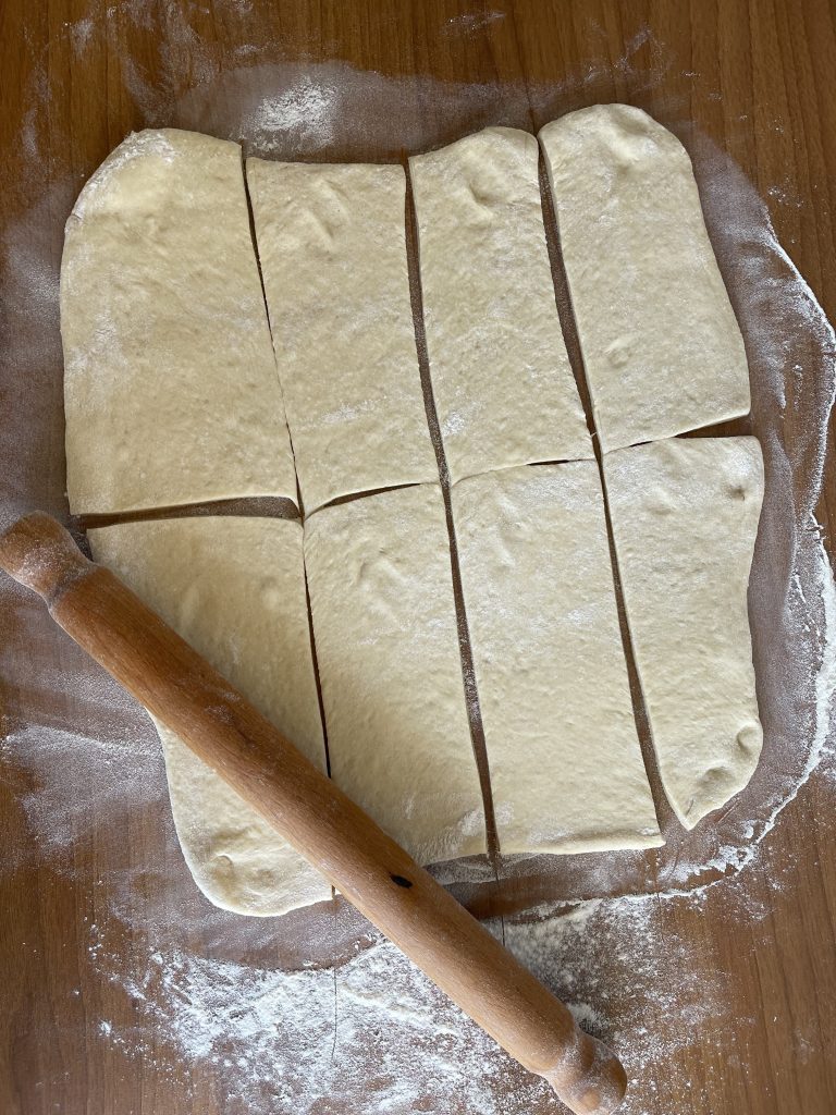 - Împărțiți aluatul in 2.Luați prima bila si întinderi o foaie dreptunghiulara de cca 40/30 cm pe blatul de lucru tapetat cu faina;