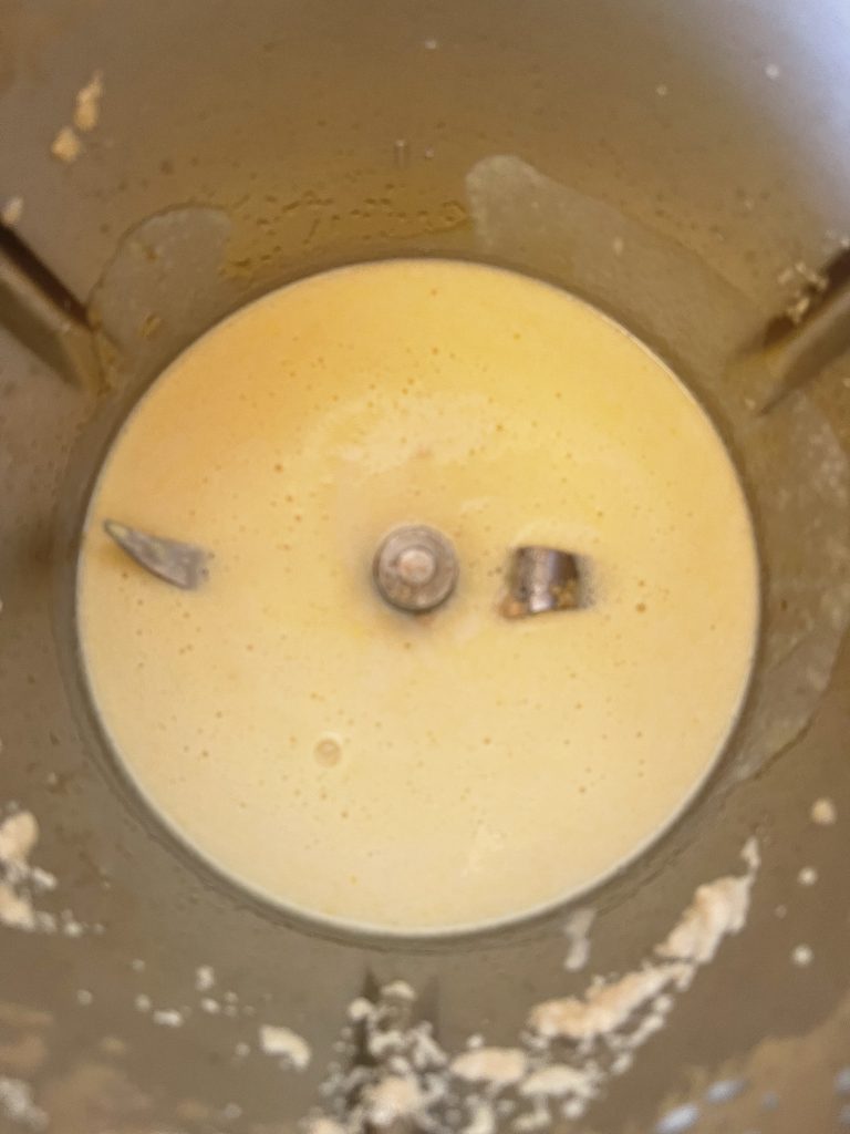 - Lăsati sa se răcorească ,apoi Adaugati ouăle și sarea și mixați 12 secunde/viteza 1;