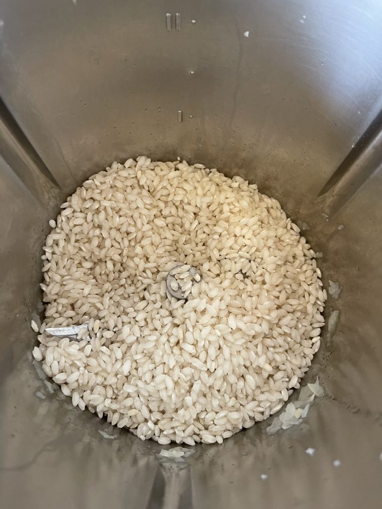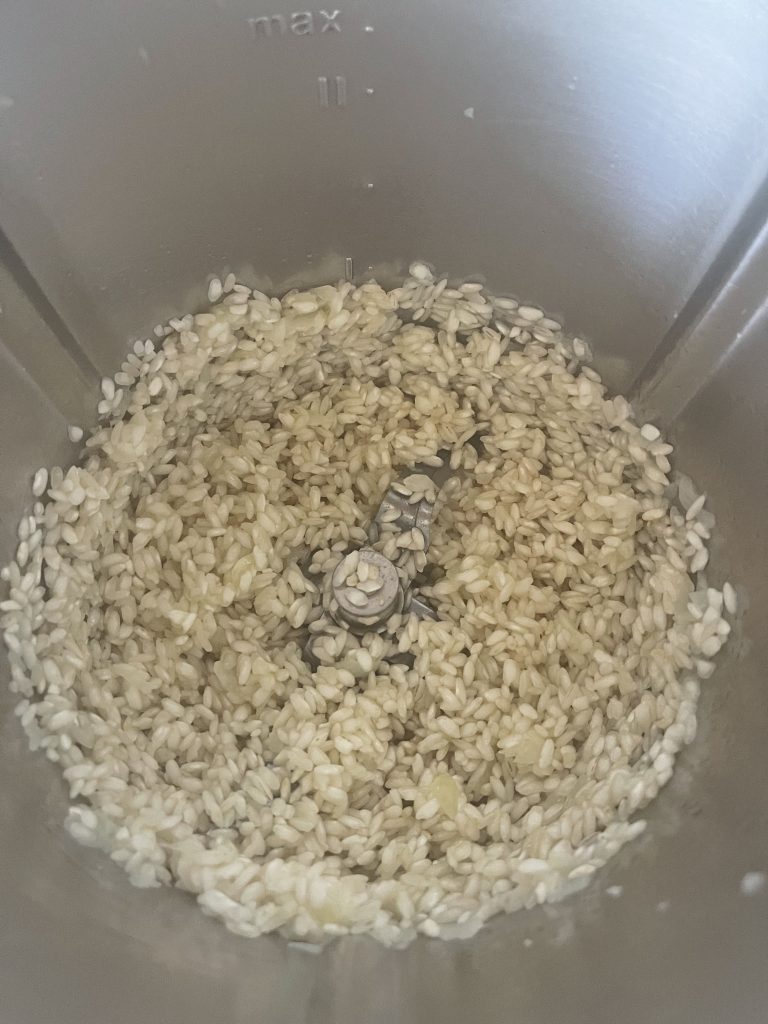 - Adaugati orezul și gatiti 3 min/120 grade/ sens antiorar/viteza 1;