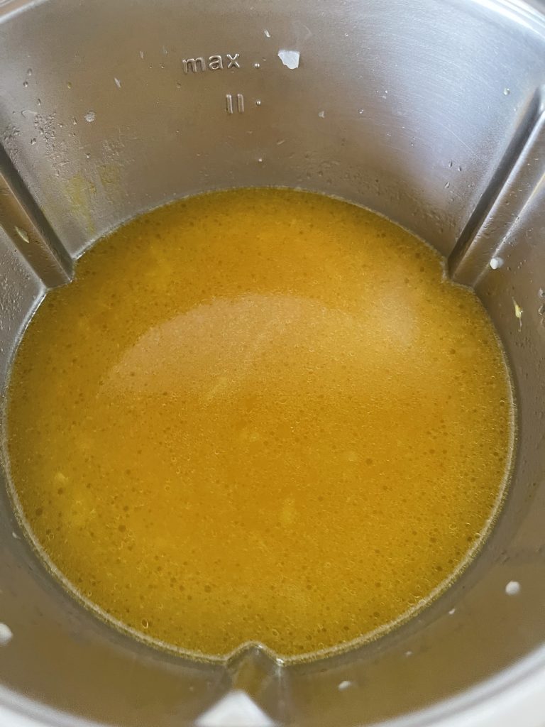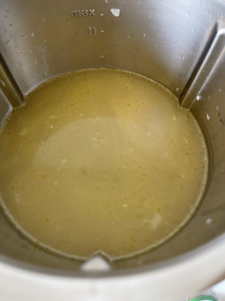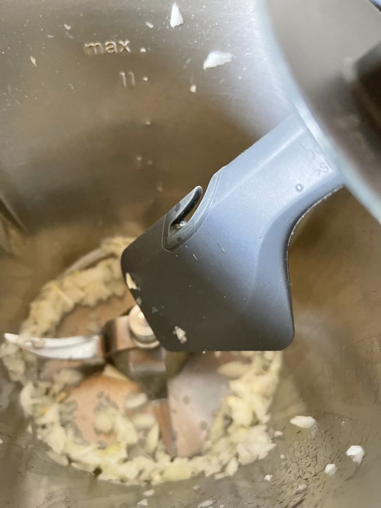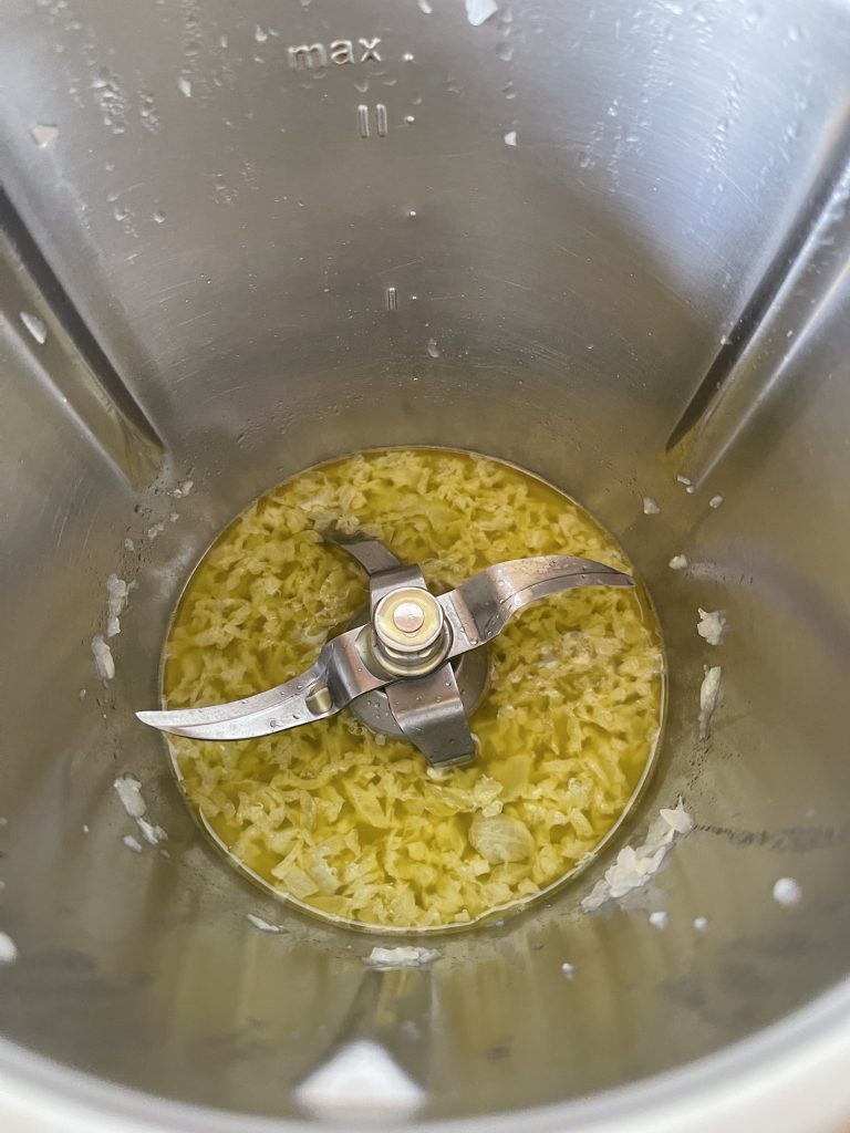- Adunați cu spatula la baza bolului, adaugati untul și uleiul de masline și sotati 3 min/120 grade/viteza 1;