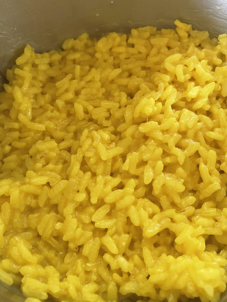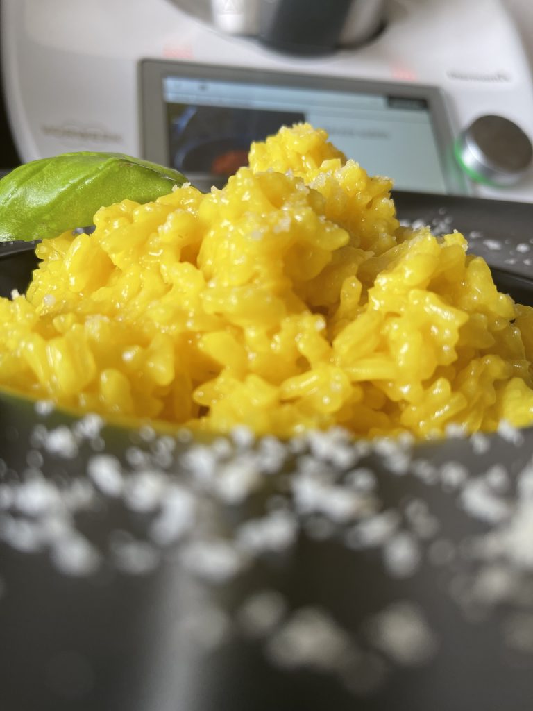 - Adaugati apa,sarea,șofranul pudra, amestecați cu spatula pentru a se incorpora orezul si continuați sa gatiti 14 min/100 grade/ sens antiorar/viteza 1;