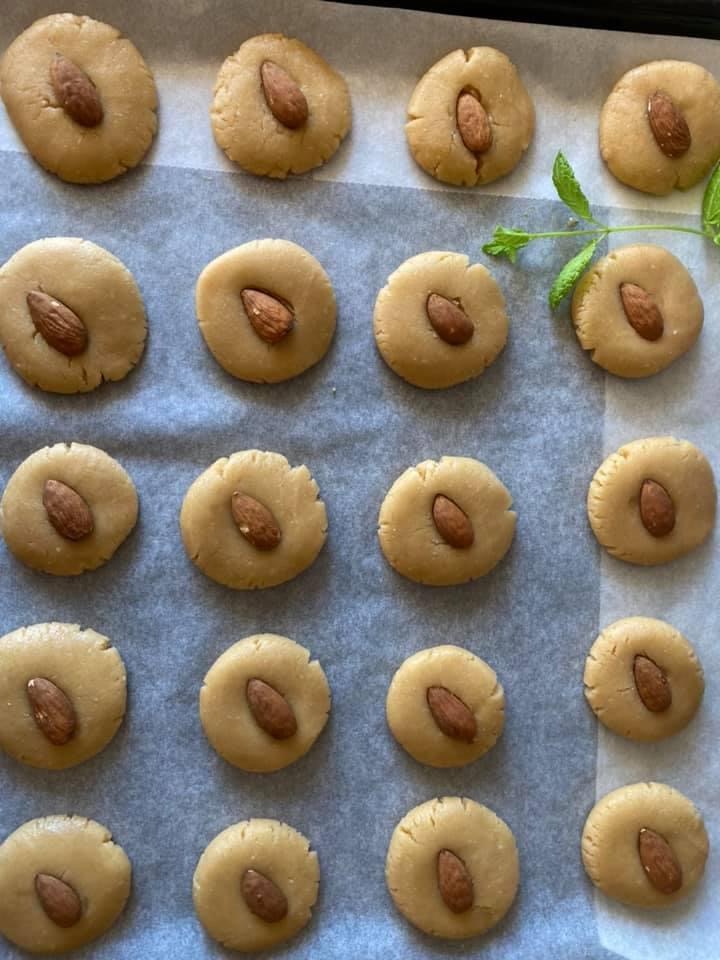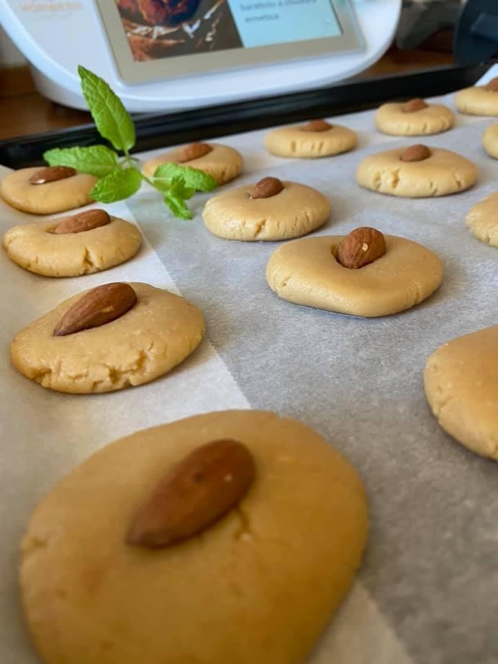 - Formati biluțe din aluat și presați ușor, apoi asezati biscuitii astfel formati pe o tava tapetata cu hârtie de copt;