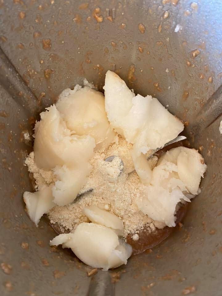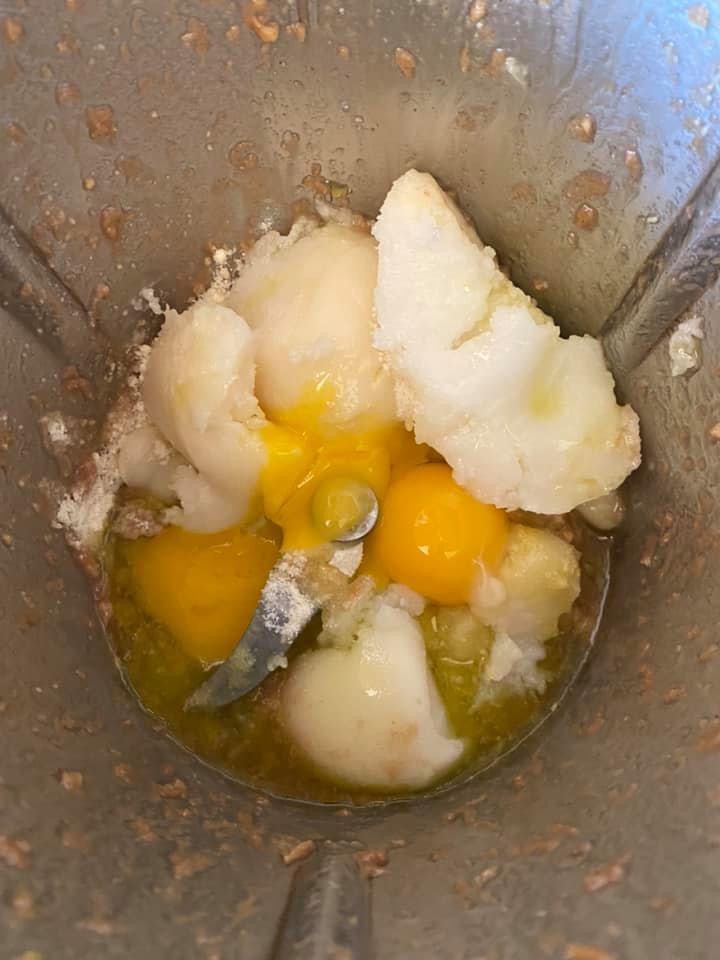 - Adaugati făina de migdale untura, uleiul de masline, gălbenușurile și amestecați 15 sec/ viteza 6;