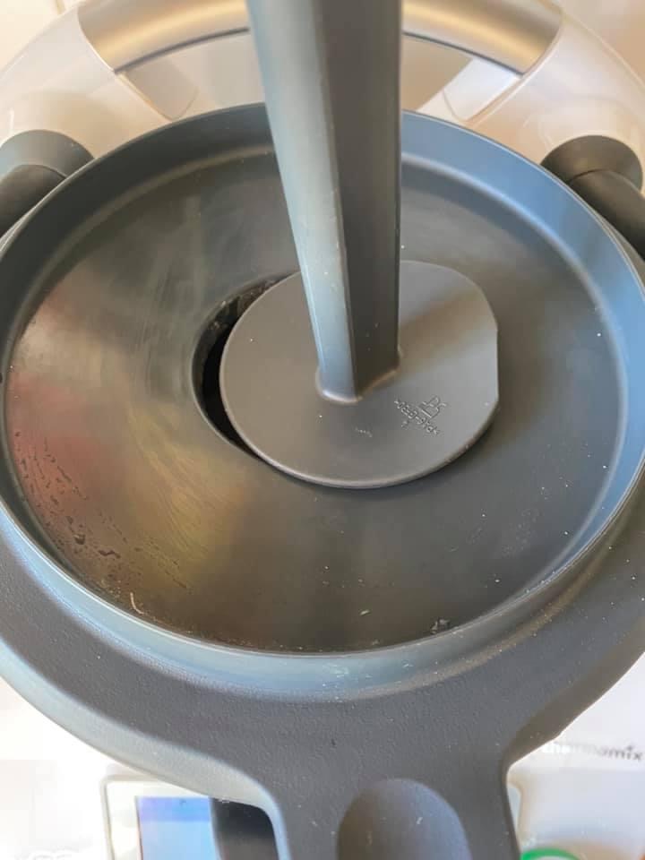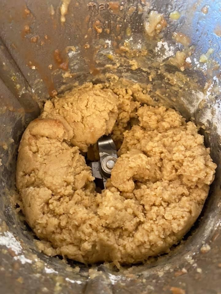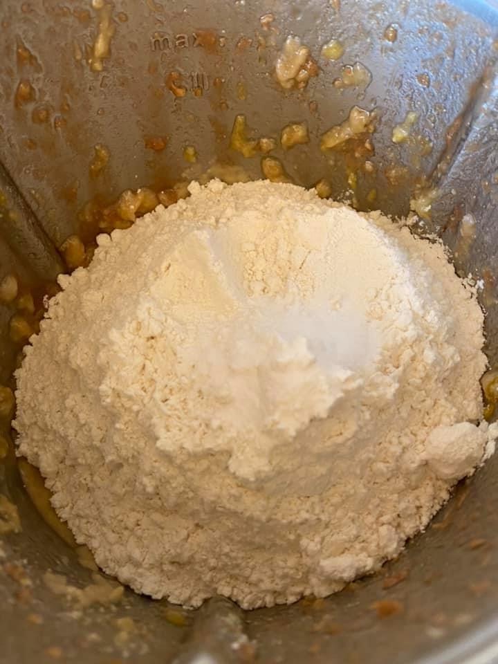 - Adaugati făina și bicarbonatul și frământări 1 min/viteza spic ajutând aluatul mestecând cu spatula prin orificiul capacului;