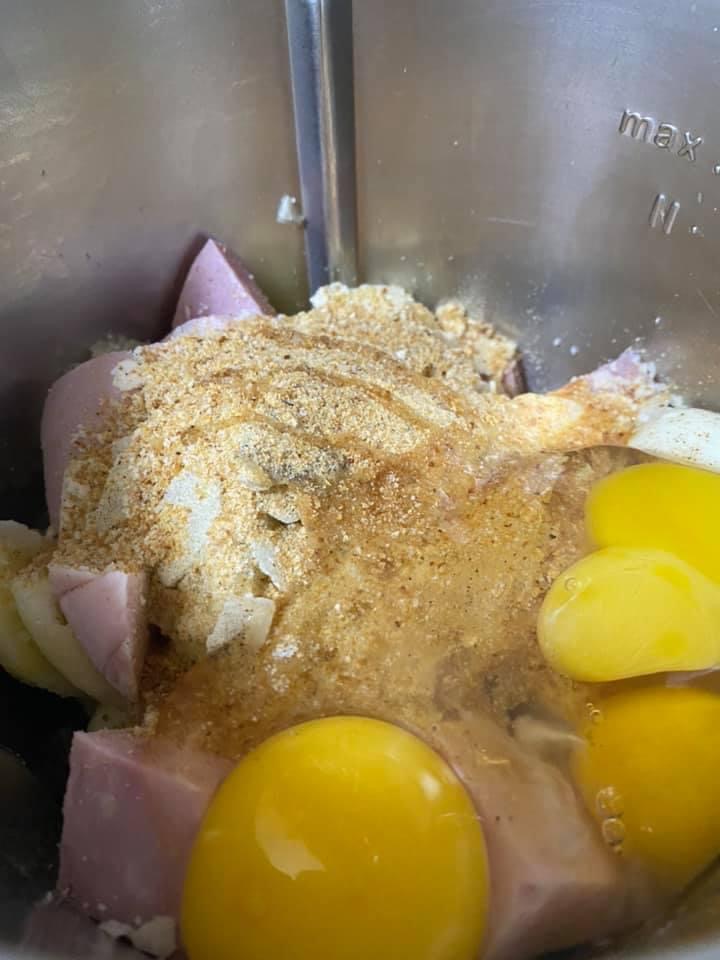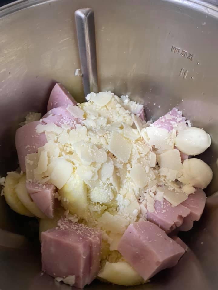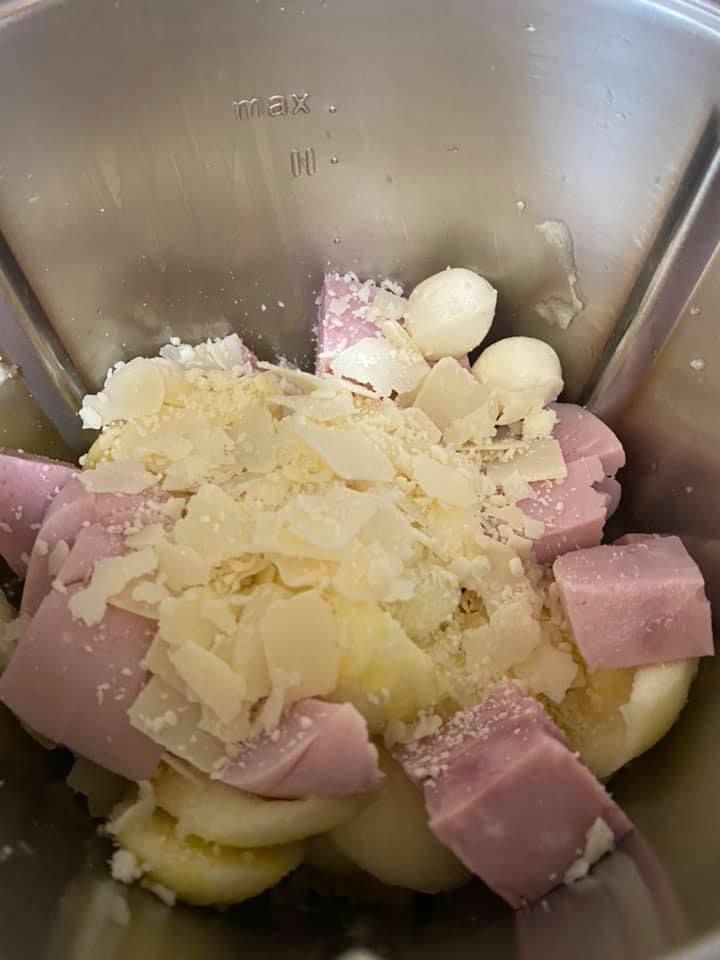 - Adaugati in bol 200 g șunca presata, parmezanul, pesmetul, sarea,piperul, ouăle, 150 g mozarella și mixați 15 sec/viteza 4;