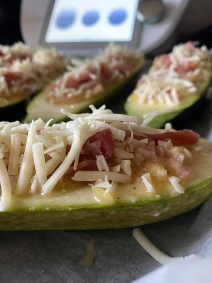 - Cu ajutorul unei linguri de înghețată sau unei linguri scobiți dovleceii tăiați pe jumătate și Asezati-i intr-o tava de cuptor tapetat cu hârtie de copt;