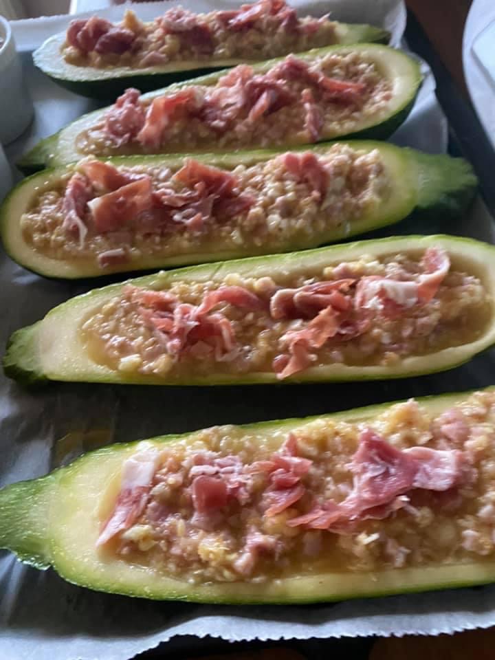- Presărați restul de mozzarella și prosciuto crudo și Coaceti in cuptorul preîncălzit la 180 grade cca 35-40 min (funcție se cuptor).