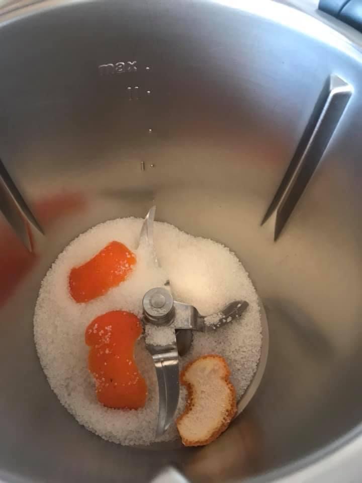 - Puneti in bol zaharul și câteva bucatele ce coaja de portocala și pulverizati 10 sec/vit 10;