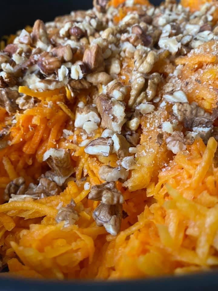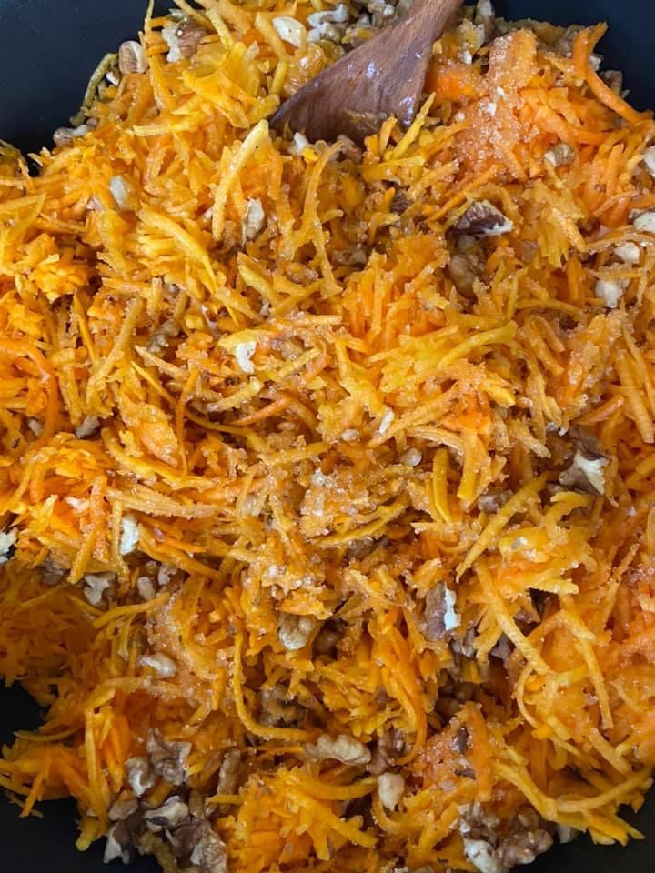 - Puneti intr-o tigaie 50 g ulei și căliți dovleacul amestecat cu zaharul și nucile;