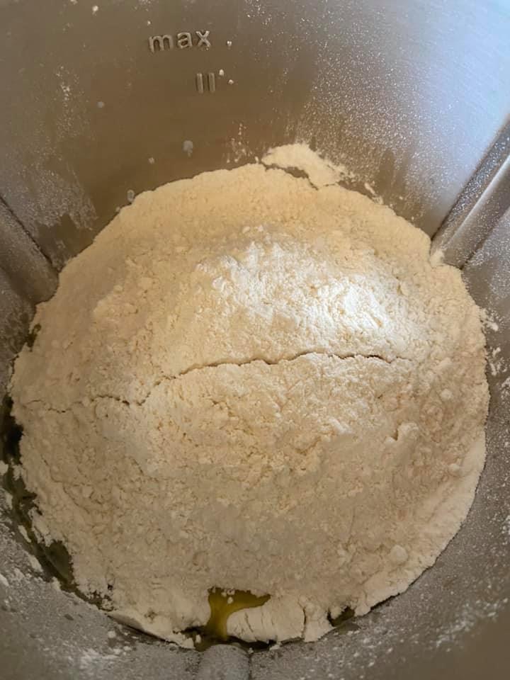 - Puneti in bol apa, uleiul, sarea și 500g făina și frământați 2 min /viteza spic;