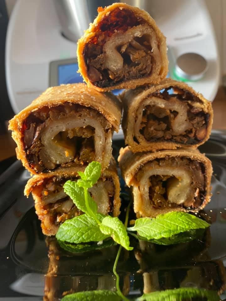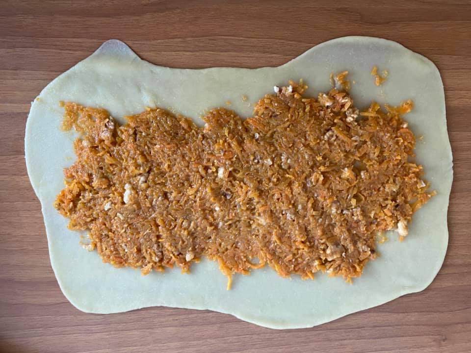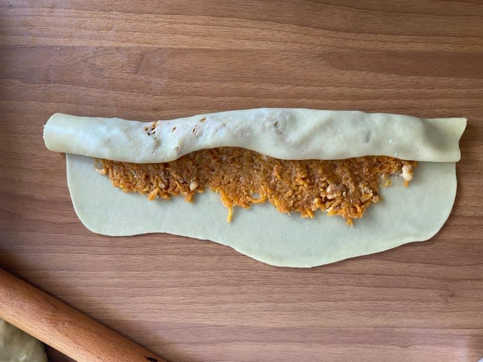 - Întindeti prima foaie de cca 40 cm/ 20 cm, adaugati 1/5 din compoziția cu dovleac, rulați cu grija și presați lateralele pentru a le Închide bine;