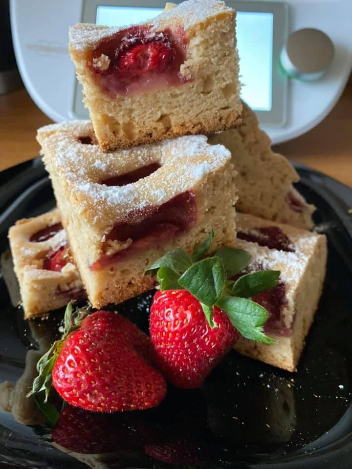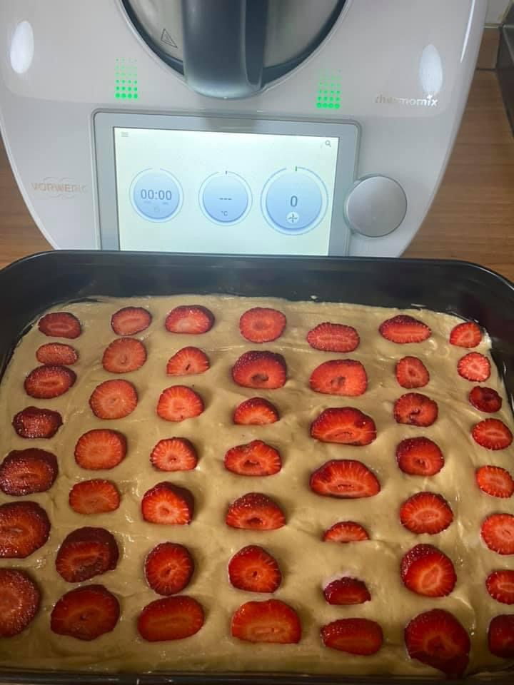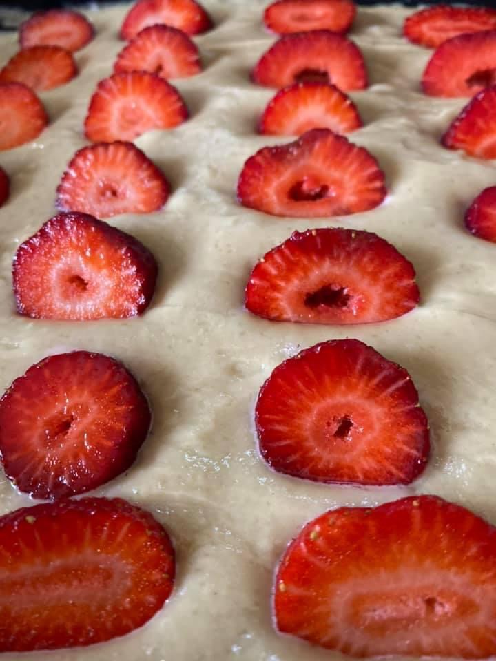 2.Puneti aluatul obținut intr-o tava tapetata cu hârtie de copt, apoi Asezati căpșunile tăiate rondele pe întreaga suprafața încercând sa le introduceri cât mai mult in aluat;