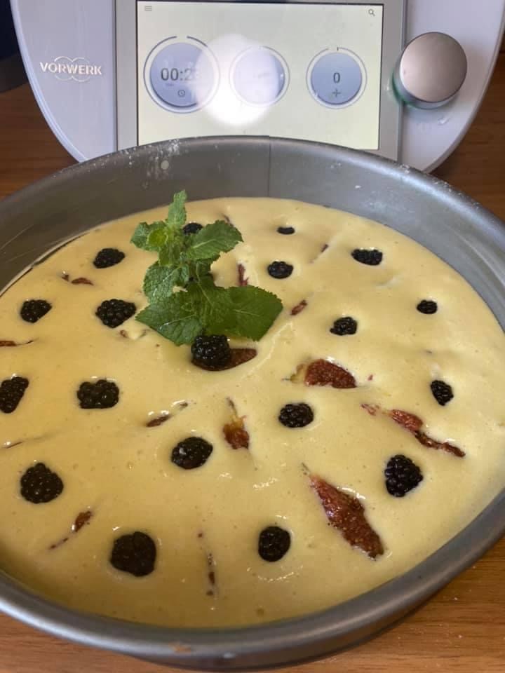 - Vărsați compoziția intr-o forma de tort cu pereți detasabili și ASE.zări smochinele tăiate in 2 sau 4, presărați murele și Coaceti cca 45 min in cuptorul preîncălzit la 180 grade;