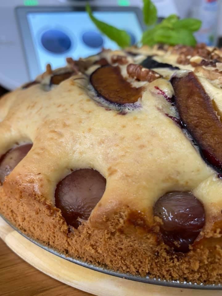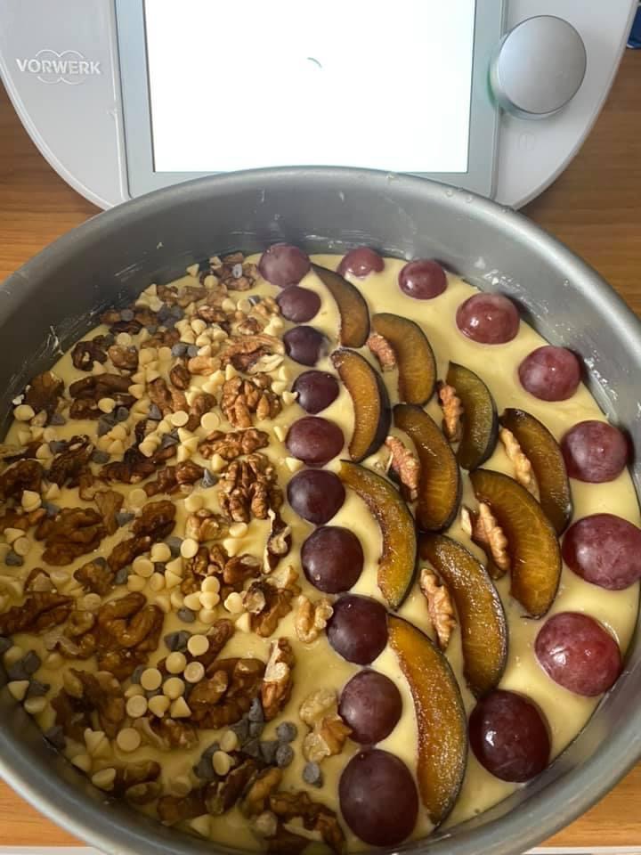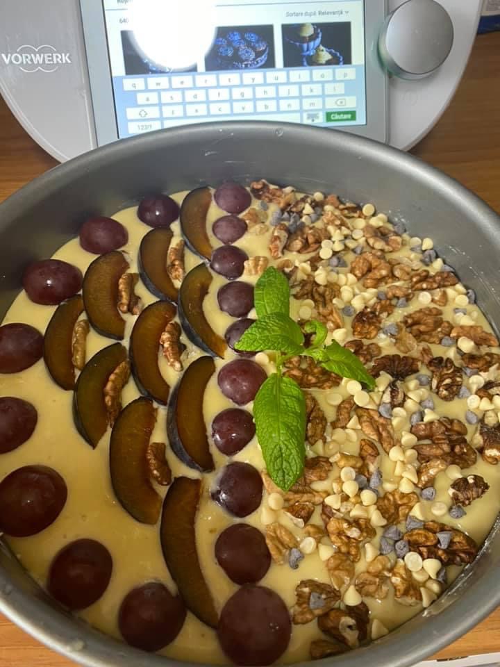 - Turnati compoziția obținută intr-o tava de tort unsa cu unt și apoi decorati 1/2 cu nuci și 1/2 cu felii de prune și boabe de struguri;