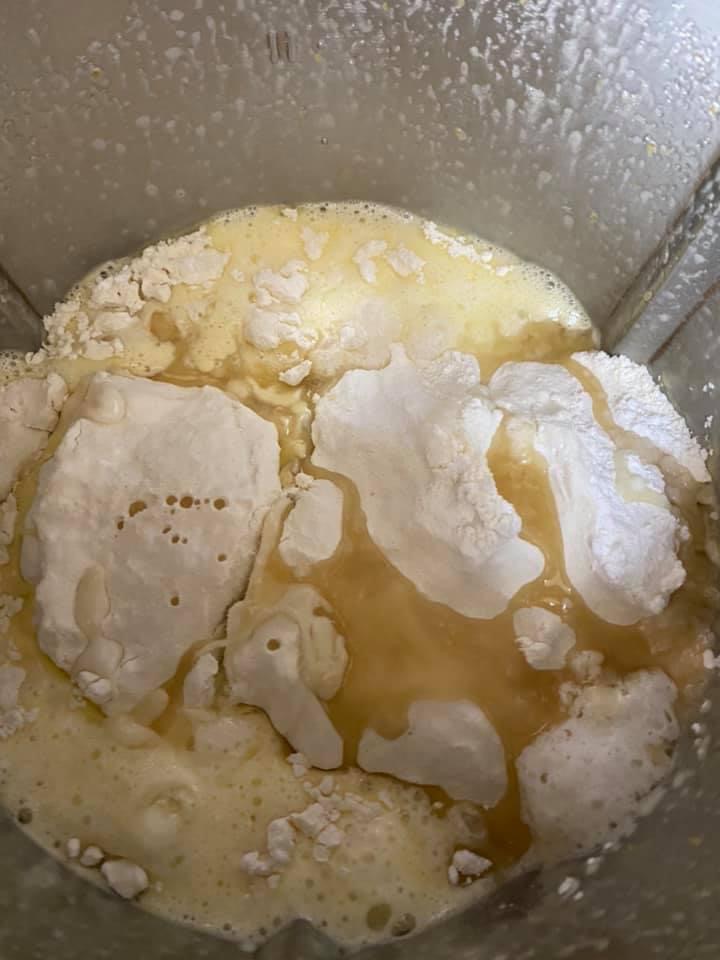 - Puneti in bol zaharul,coaja de lamaie și ouăle 2 min/viteza 4;