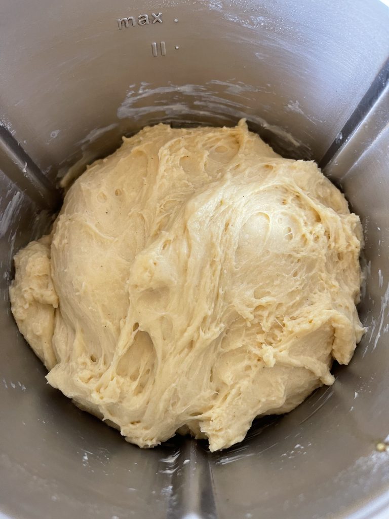 2. Adaugati faina, ouăle,sarea,uleiul, pasta de vanilie și frământați 4 minute/viteza frământare;