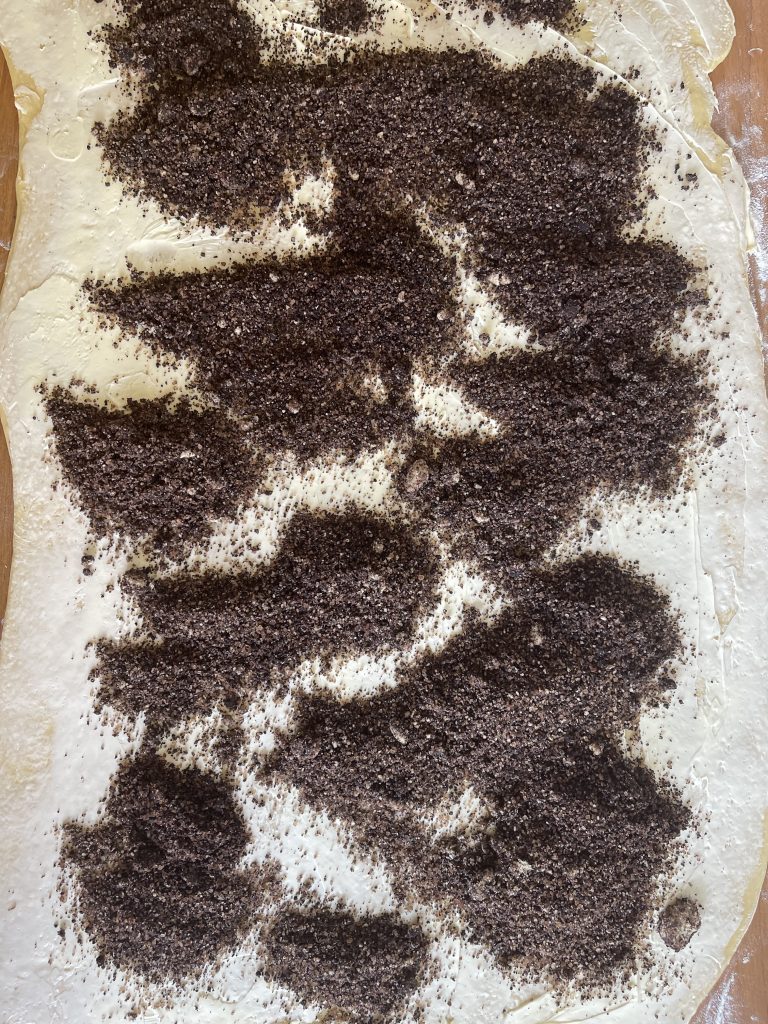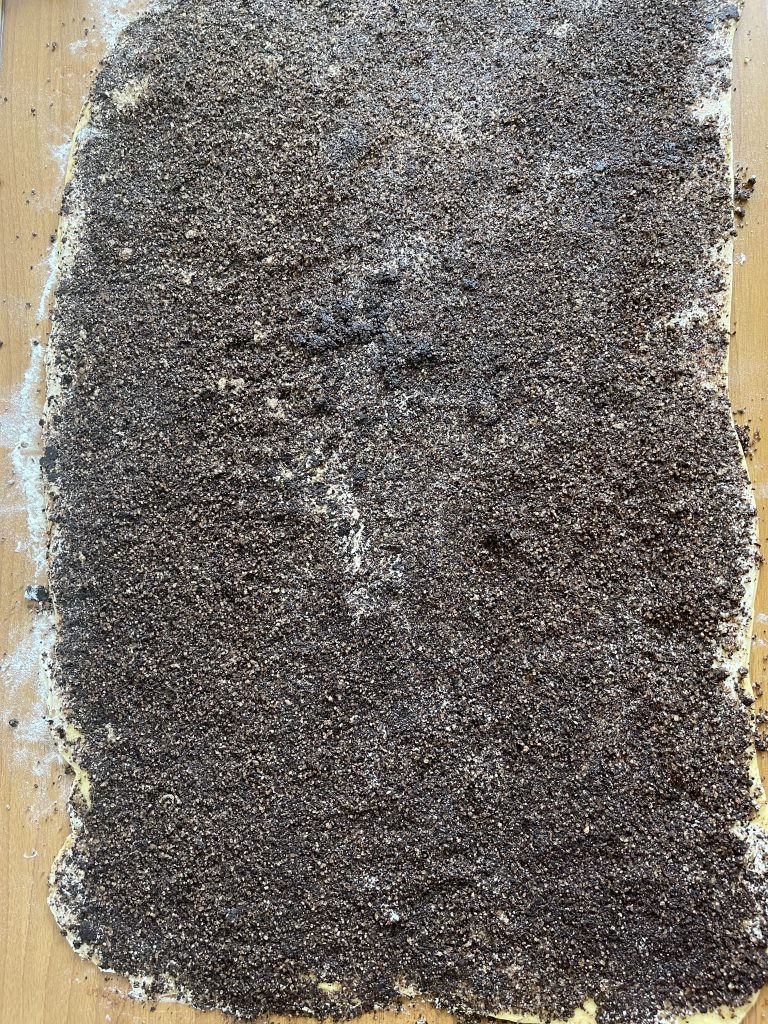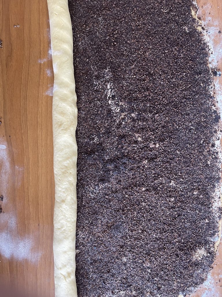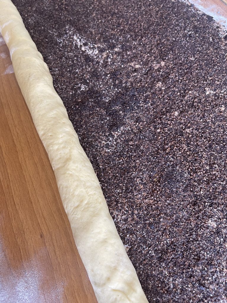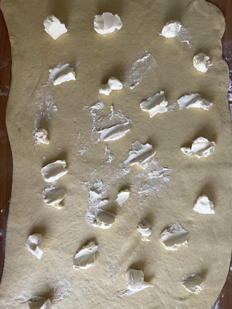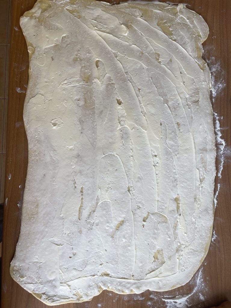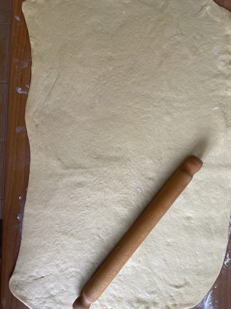 7. Luați aluatul crescut și cu ajutorul unui sucitor intindeti pe blatul de lucru tapetat cu faina o foaie dreptunghiulara cât mai mare -cca 60/40 cm;