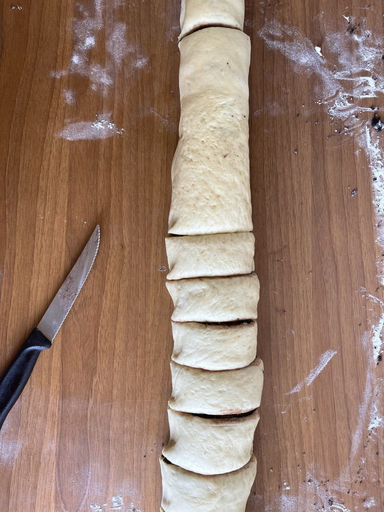 9. Rulați strâns pana la capăt, apoi tăiați ruloul de aluat in 16 părți egale;