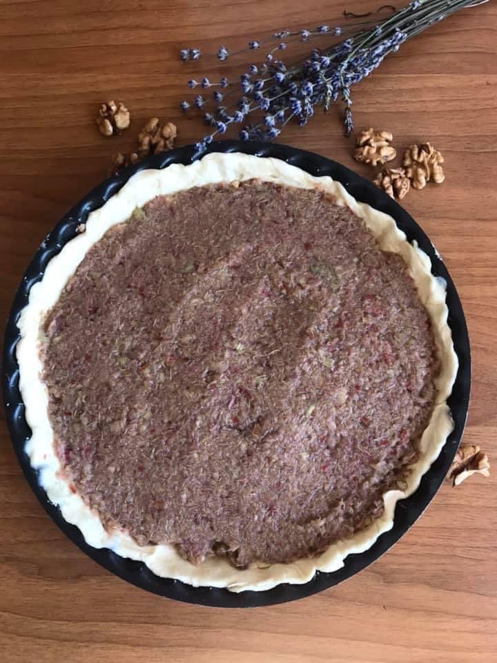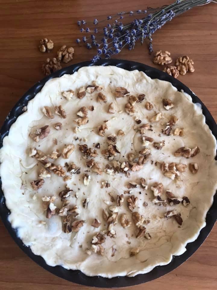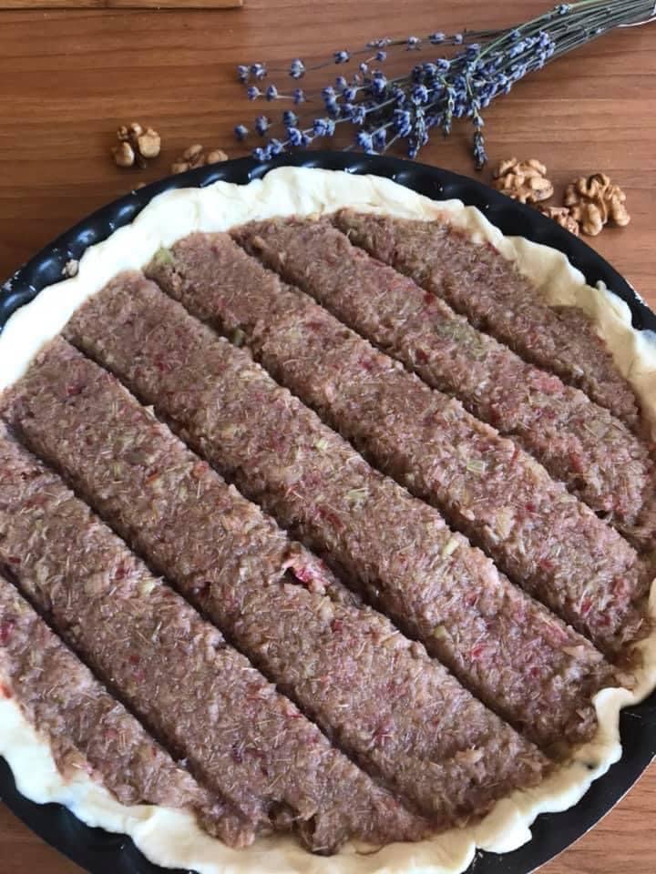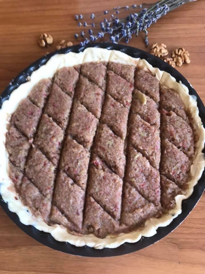 6.Intepati aluatul și presărați nucile,apoi Turnati rubarba tocata ,netezit si apoi formați nuste Șanțuri cu spatula.