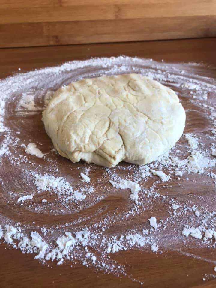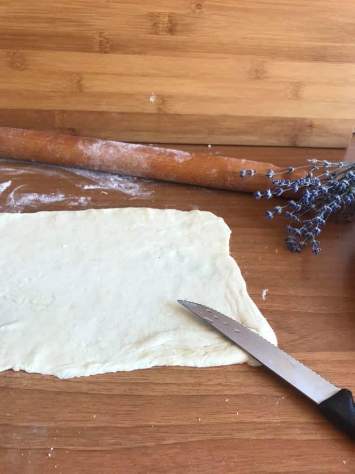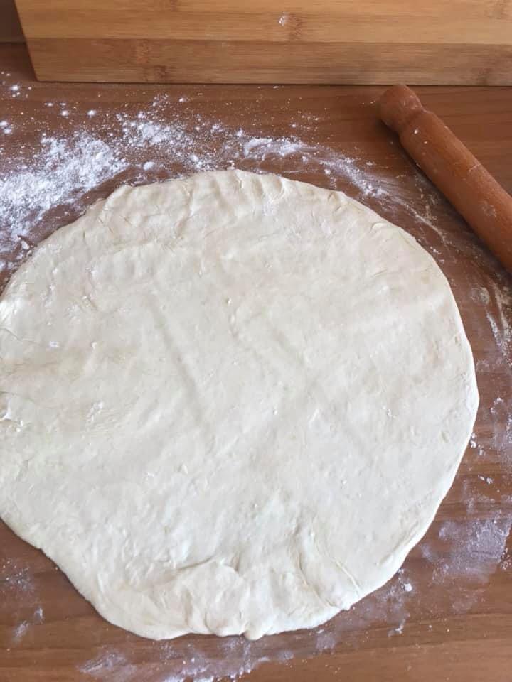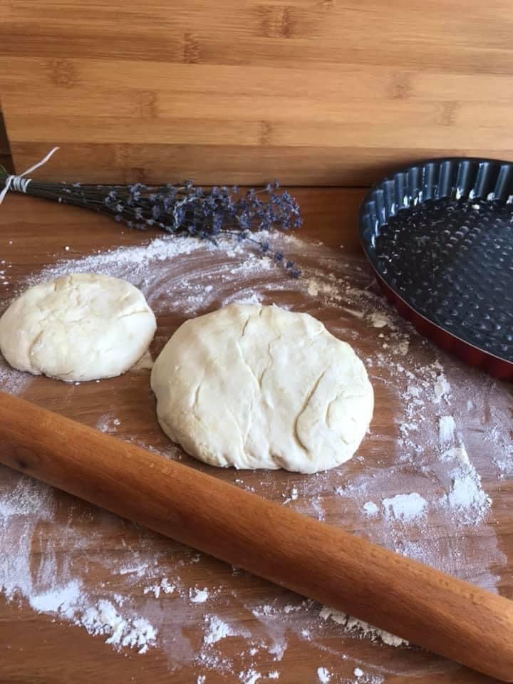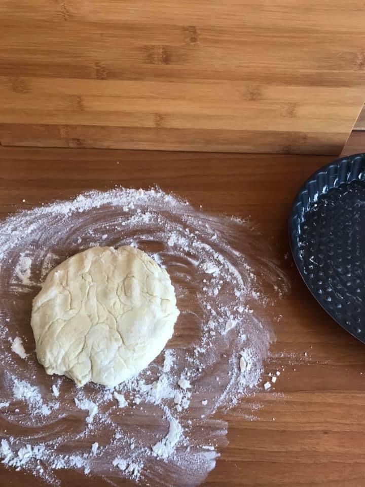 5.Impartiti aluatul in 2 bile 1/4 și 3/4 și cu bila mare formați o foaie pe care o așezati pe o tava de Tarta.